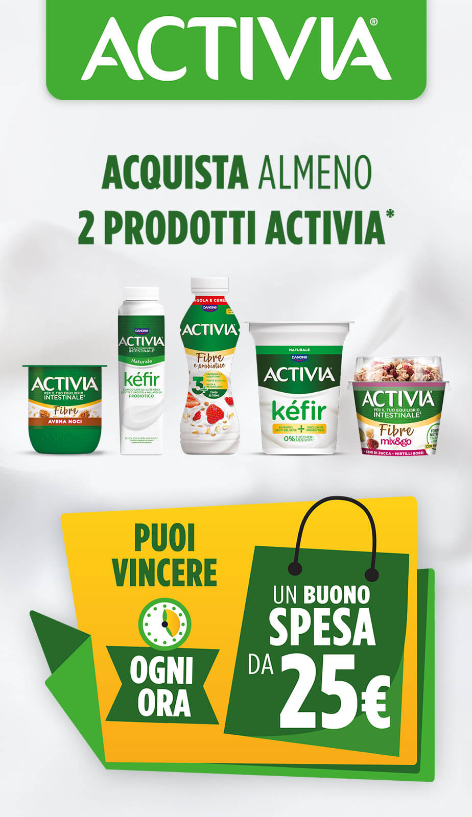 Acquista almeno due prodotti Activia in un unico documento d’acquisto. Puoi vincere ogni ora un buono spesa da 25€.
